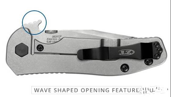 “波浪形开口特征”也被称为遥控口袋开启器,在叶片的后端。 独特的波浪形状是钩子,使得用户能够在从口袋中取出时打开刀。